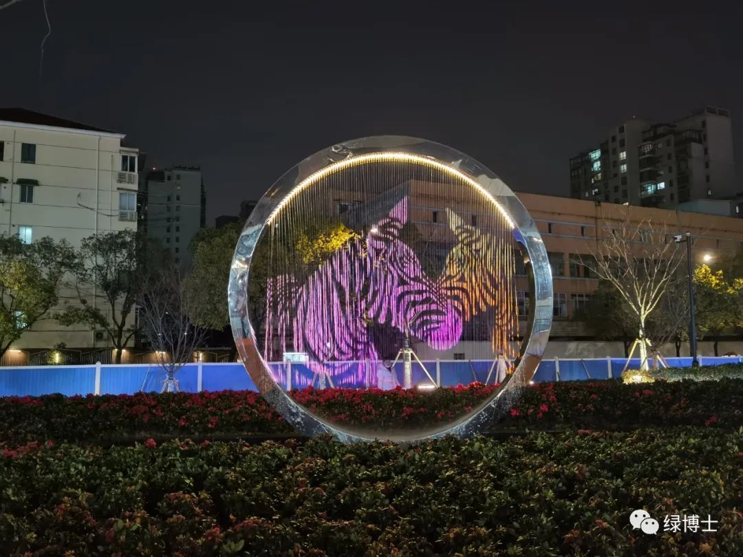 夜晚的斑马绿地别有一番景致。景观照明设计构建高区乔木照明、中区草坪及地被边缘照明和低区步道照明三个空间层次,营造出柔和舒适的氛围。叶片型花坛的中央设有圆环景观雕塑,采用不锈钢材料制作。雕塑内置有落水水幕装置,底座采用镜水方案并作为落水水幕的循环蓄水池,夏季,通过蓄水池喷淋出的水雾送来丝丝凉爽。入夜,“斑马”主题形象被投影在水幕之上,灯光与水雾结合,美轮美奂,仙气十足。