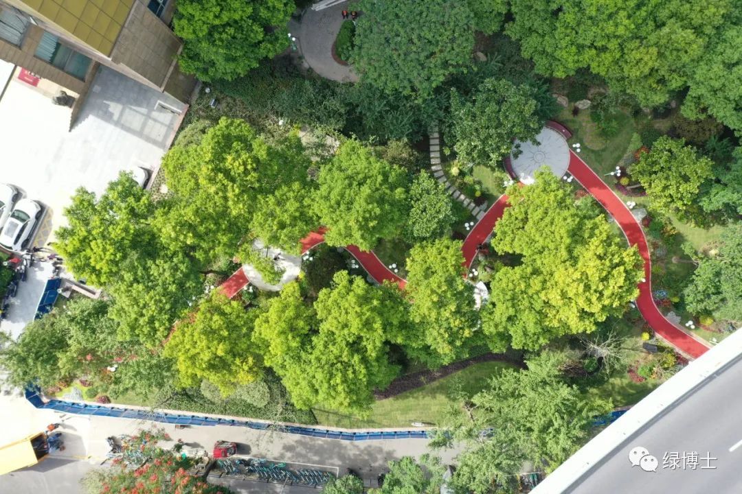 公园内,一条红色透水混凝土绿道串联起休憩互动、科普展示等不同功能的空间,沿路有休闲座椅、科普知识小景,可以学一学植物知识,闻一闻清新花香,或者坐下来感受自然的能量,感受城市的美好。