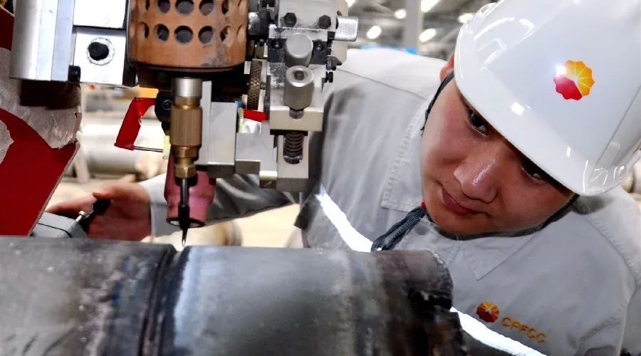 裴先峰正在进行广东石化炼化一体化项目氩、埋一体化管道自动焊机培训焊接操作示范。