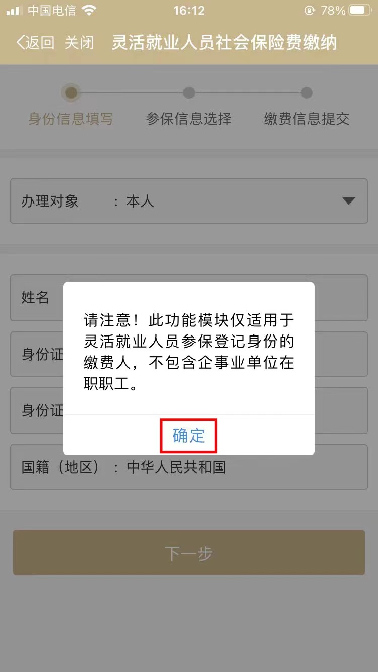 系统会提示“此功能模块仅适用于以灵活就业参保登记身份的缴费人,不包含企事业单位在职职工”,点击“确定”。