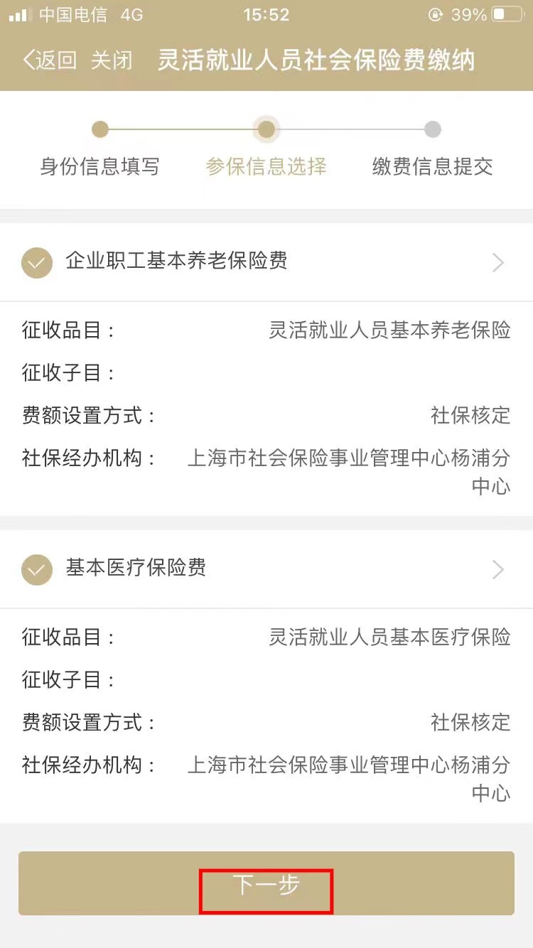 系统会带出缴费人参保险种信息,核实无误后,点击“下一步”。