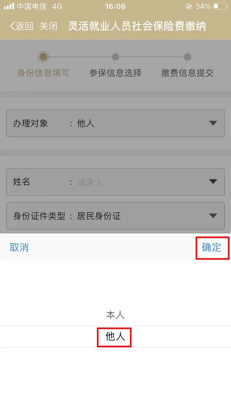 若为他人缴费,点开“办理对象”,选择“他人”,点击“确定”。
