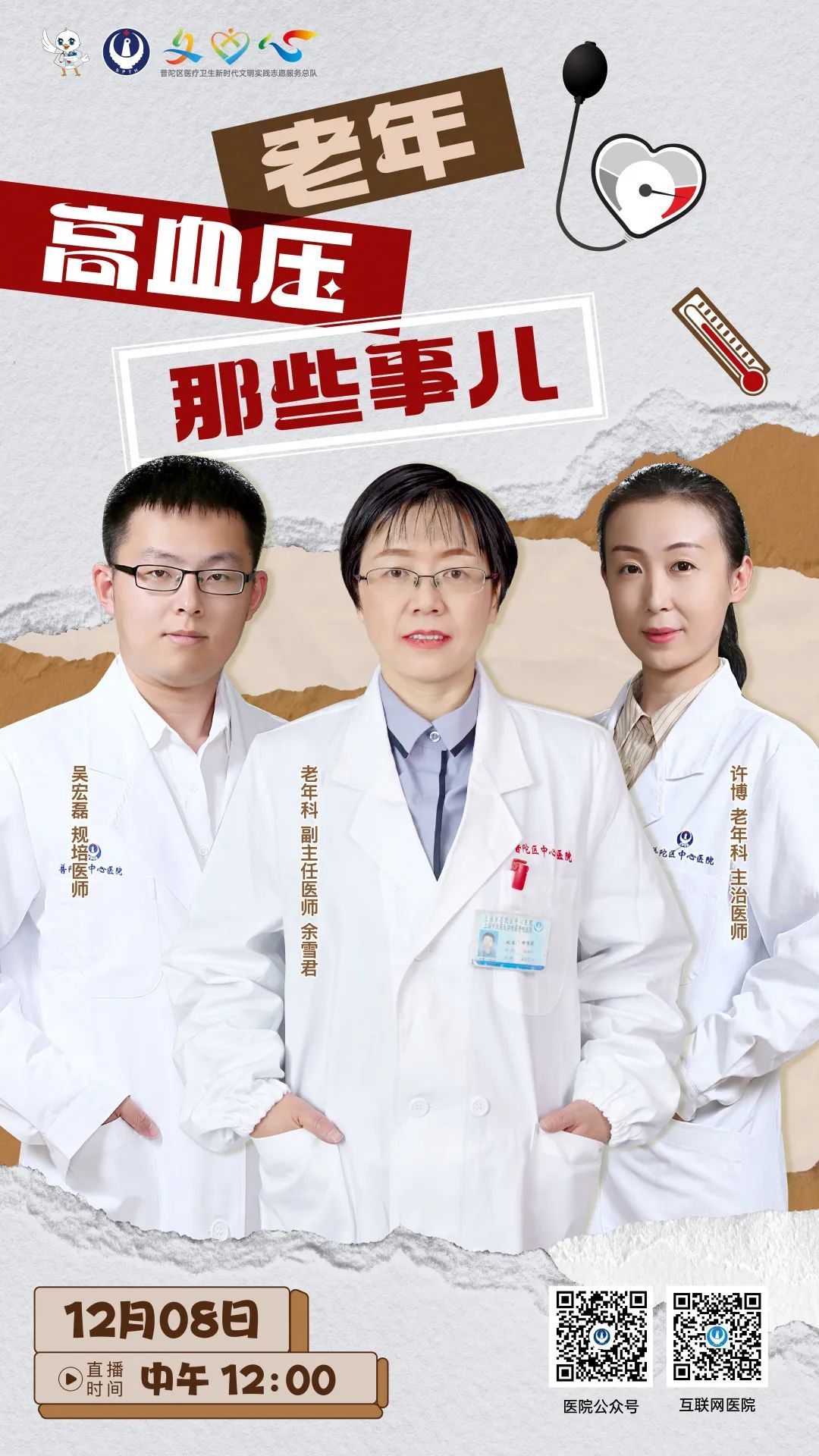 12月8日(周四)12:00,普陀区中心医院5G健康直播间将以《老年高血压那些事儿》为主题,由老年科副主任医师余雪君,主治医师许博,规培医师吴宏磊一起搭档,来聊一聊老年高血压病的“特殊之处”、表现特点以及日常生活中的控制预防。观众朋友们,让我们不见不散~