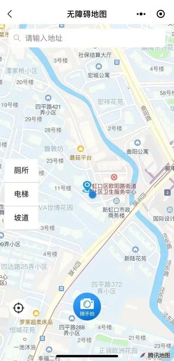 进入无障碍地图,可查看附近5公里之内的无障碍厕所、电梯、坡道,进入详情可查看地址、照片、开放时间等。进入随手拍,可对现场照片、所在地点进行系统上传,持续更新信息库,为残疾人出行保驾护航。