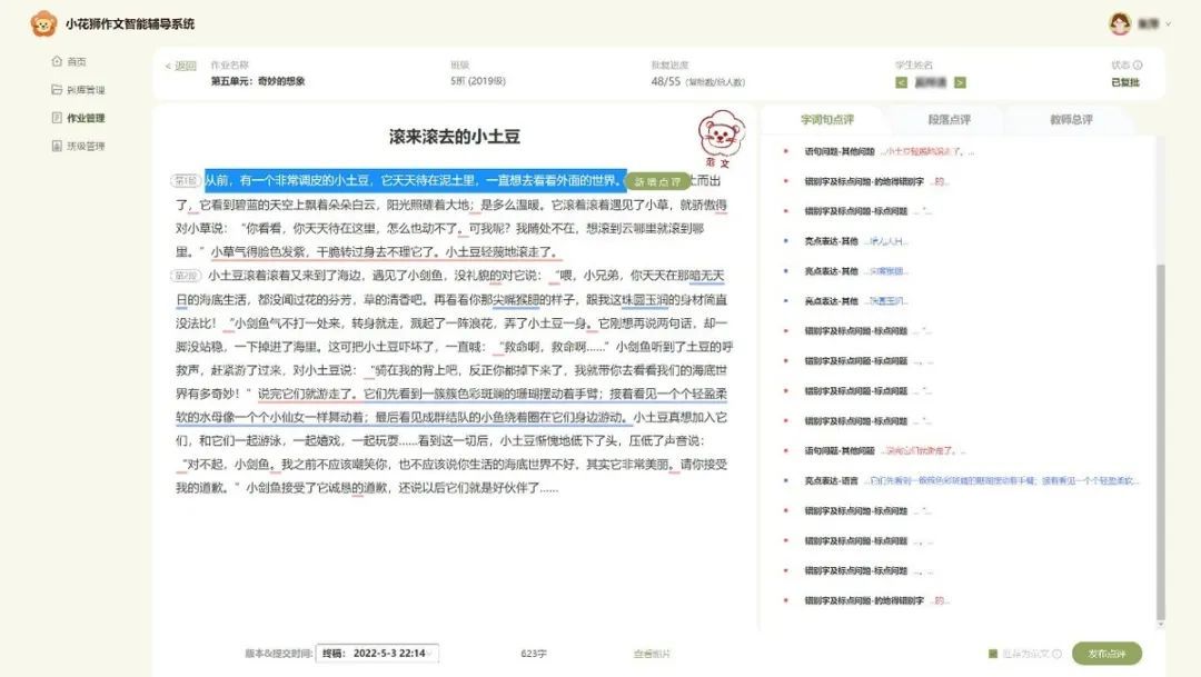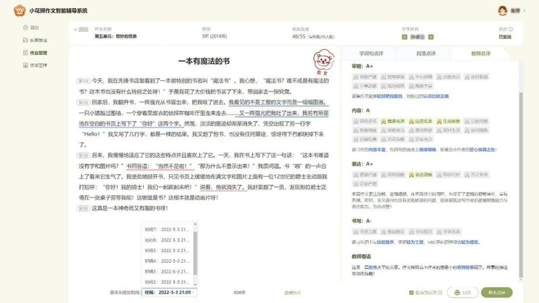 “小花狮”的教师端是一个智能化的教学辅助平台,系统支持教师设置单元习作任务、小组互评任务和合作式写作等教学活动,在系统自动给出智能初评意见后,教师可以进一步通过点选标签、新增评价和语音点评等方式快速地复批作文,还可以查看学生修改历史记录,设置优秀范文和打印在线批改结果等。