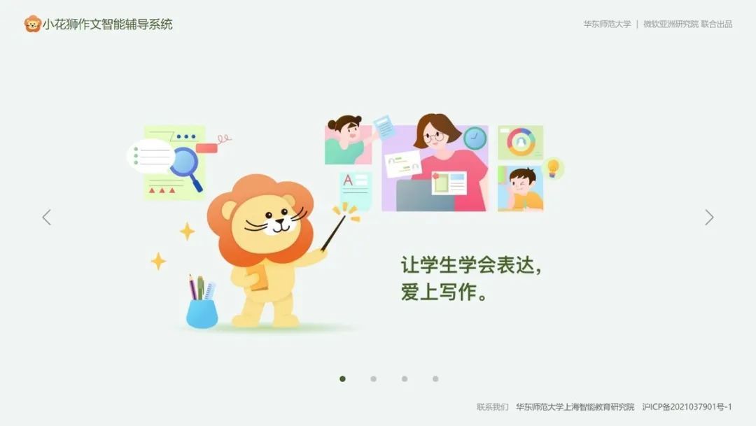 这款名为“小花狮”的中小学作文智能辅导系统,是由华东师范大学和微软亚洲研究院联合研发推出的智能化教辅产品,旨在推动中小学作文基础教学的数字化转型,服务一线语文教师和广大中小学生。