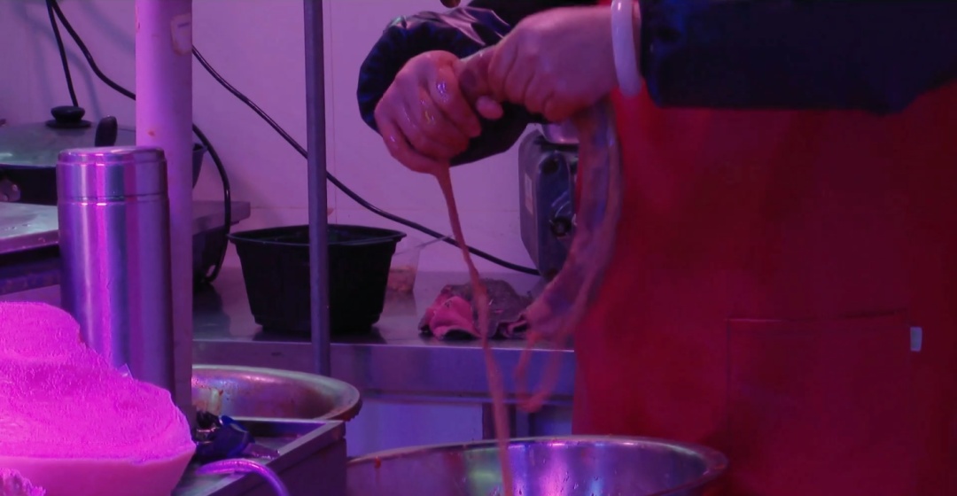 都说腊味是四川人的执着,来自四川的摊主蔡女士对制作腊肠很有一套,她用“秘制”调料腌制好的猪肋排塞进猪小肠做的肠衣内,待风干后就能成为独具风味的排骨腊肠。蔡女士表示,低于10℃的气温是制作腊肠的最佳时机,这样做出来的腊肠不易变质。