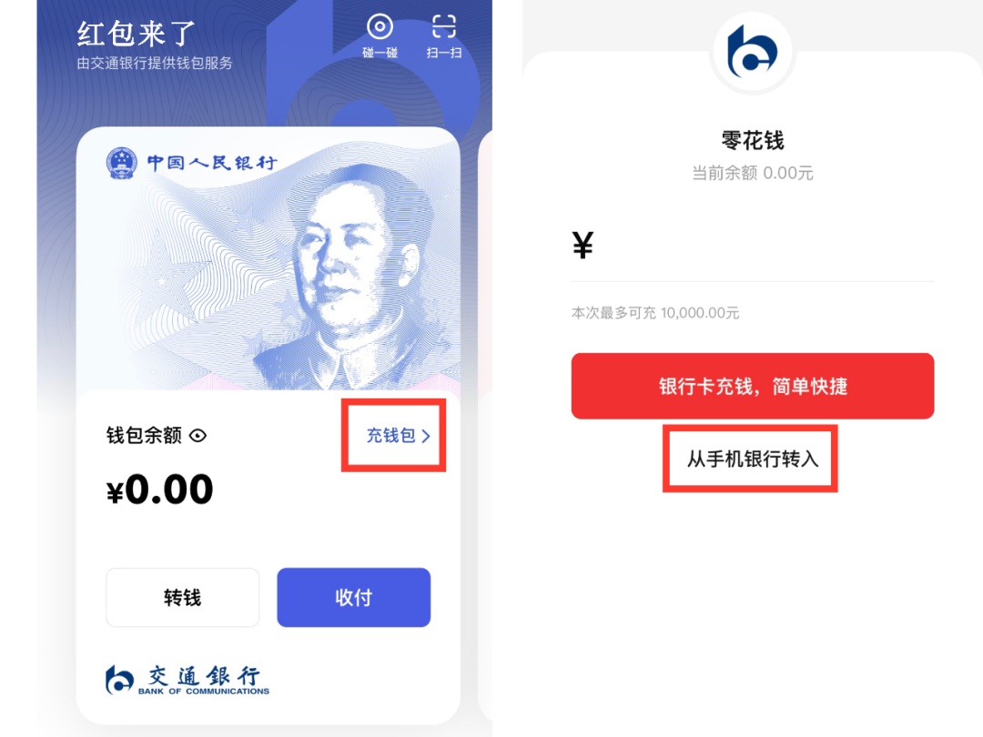 数字人民币零花钱用完了?试试在“数字人民币APP”里“拉起”你的手机银行完成充值。