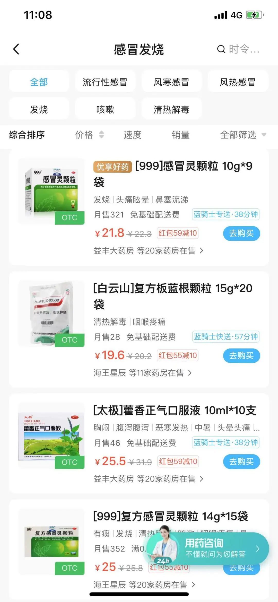 随着防疫政策调整,不少市民开始购买常用药品囤在家中,多款感冒镇痛药物销量有明显的增长。记者查询饿了么、美团等线上平台发现,感冒发烧类药物细分为流行性感冒、风寒感冒、风热感冒、发烧、咳嗽、清热解毒、退烧贴、退热贴、体温计这几类。其中感冒灵颗粒和复方感冒灵颗粒的销量在徐汇区销量第一,月售量均超过300份,远高于板蓝根、牛黄解毒等药物。