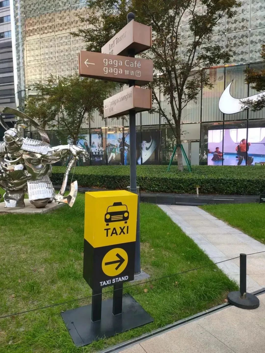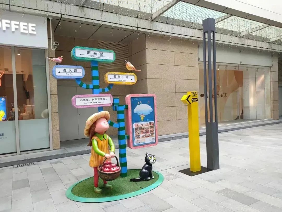 长宁区建交委结合虹桥南丰城亲子时尚地标的商场定位,和亲子出游打车的目标群体特征,配合商场内部活泼可爱的导视牌雕塑设计了长颈鹿及小黄人形状的个性化引导牌,增加儿童趣味性文化装饰性元素。