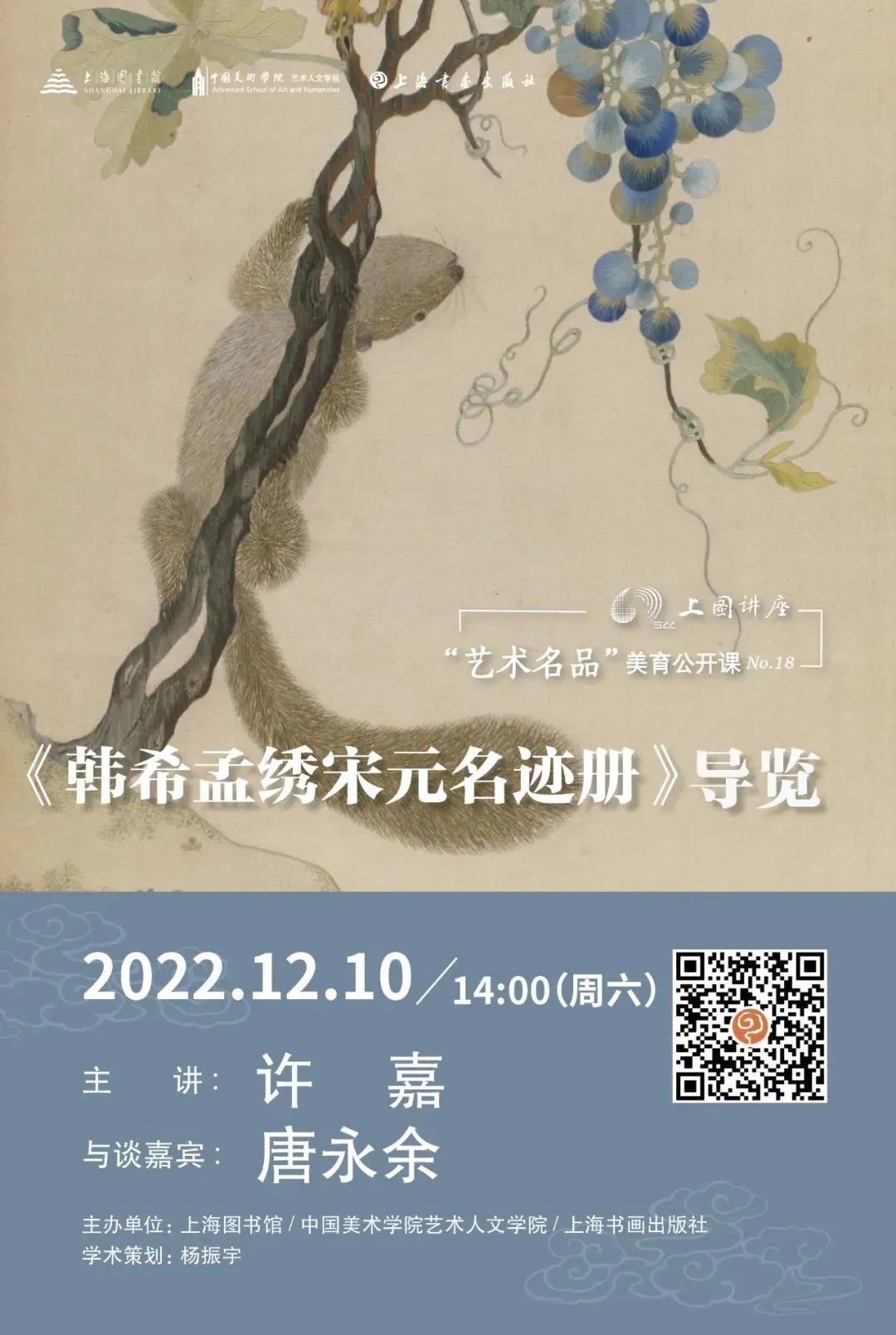 在中国刺绣艺术的历史长河中,顾绣因为其与文人画的亲密关系,从而进入了中国美术史的殿堂,其中韩希孟身为顾绣的代表人物,《韩希孟绣宋元名迹册》可视为绣画艺术中的巅峰之作。此次讲座将围绕“绣画”的历史脉络、顾绣绣者及其代表作、顾绣的影响展开,重点介绍《韩希孟绣宋元名迹册》的创作缘起及分析其艺术特点,从而展现中国传统刺绣艺术的审美高度和研究价值。