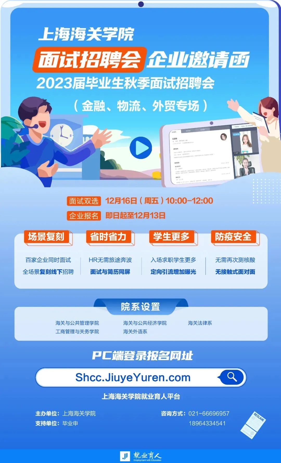 活动时间:12月16日(周五)10:00-12:00报名截止:12月13日企业招聘:学校就业育人平台网页端(PC)学生面试:学校就业育人平台小程序(微信)