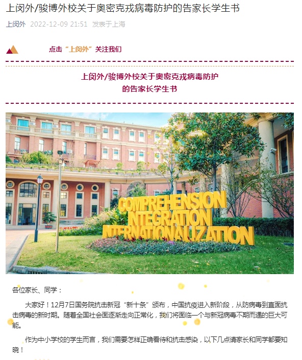上海外国语大学闵行外国语中学、上海市骏博外国语学校12月9日晚发布关于奥密克戎病毒防护的告家长学生书,提示学生和家长用平常心对待,且注意日常自我健康防护。