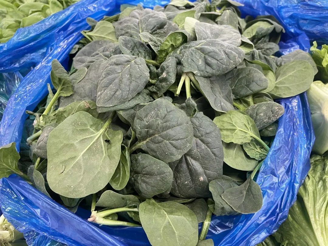 除此之外,摊主还向记者介绍了来自崇明、南汇的本地菠菜,其根茎较短,别看摊在袋子里看起来软趴趴的,卖相不是很好,但是相对整齐的长根茎菠菜,这种菠菜反而更鲜嫩。