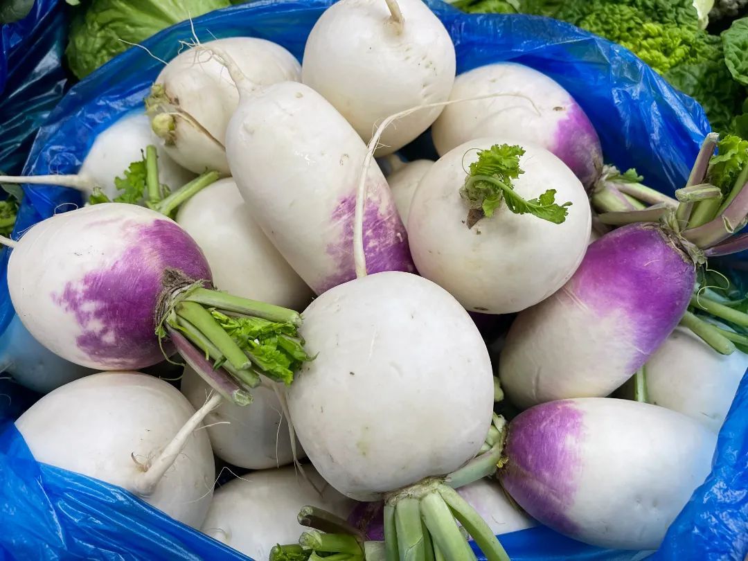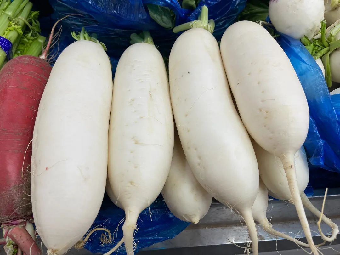 另外,作为冬季养生必备的萝卜,分长和圆两种。摊主介绍,长条状的普通萝卜水份较多,适合煮汤。而圆萝卜则适合与荤菜一起红烧,风味各不相同。