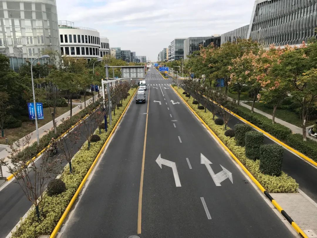 申虹路(润虹路—扬虹路)位于虹桥枢纽核心区域,道路全长约500米,路面宽度约25米,两侧人行道种植了胸径超过18cm的栾树,行道树之间用人行道绿带连接。道路绿化有两侧绿地,两侧绿地花灌木品种以樱花、桂花等花灌木为主,还有双排美国紫薇,红叶石楠、金森女贞、彩叶栀子等色叶绿篱。