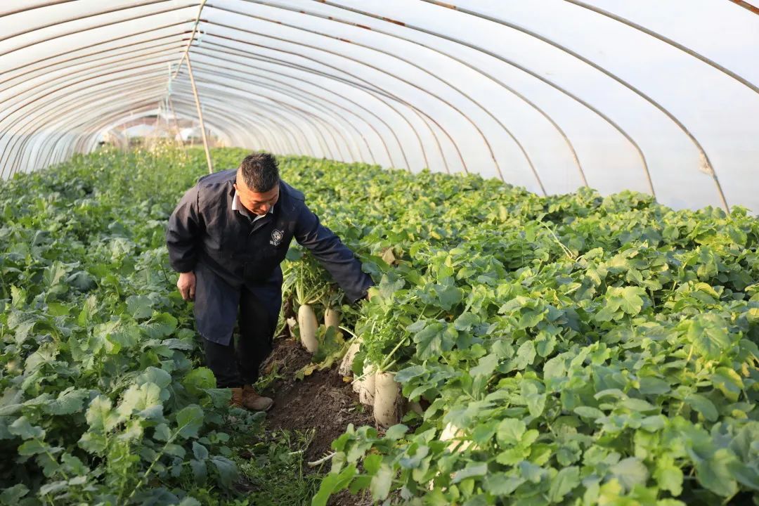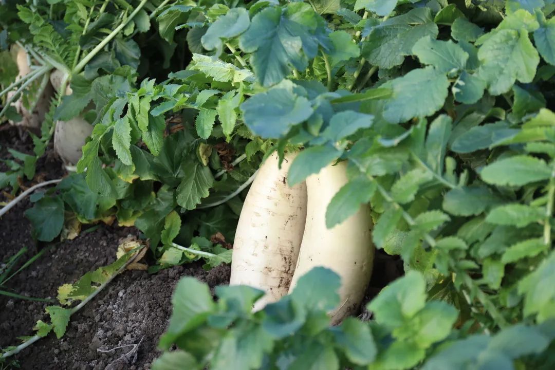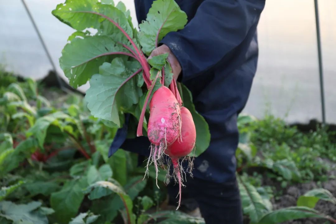 大棚里,绿油油的萝卜地里藏着一个个或白或青或红的萝卜,负责人李林平介绍,目前15个大棚内共种植了4个品种的萝卜:“白萝卜是主打品种,最大的重达15斤,口感清甜无渣、皮薄肉实,做泡菜或者煲汤都很不错。”