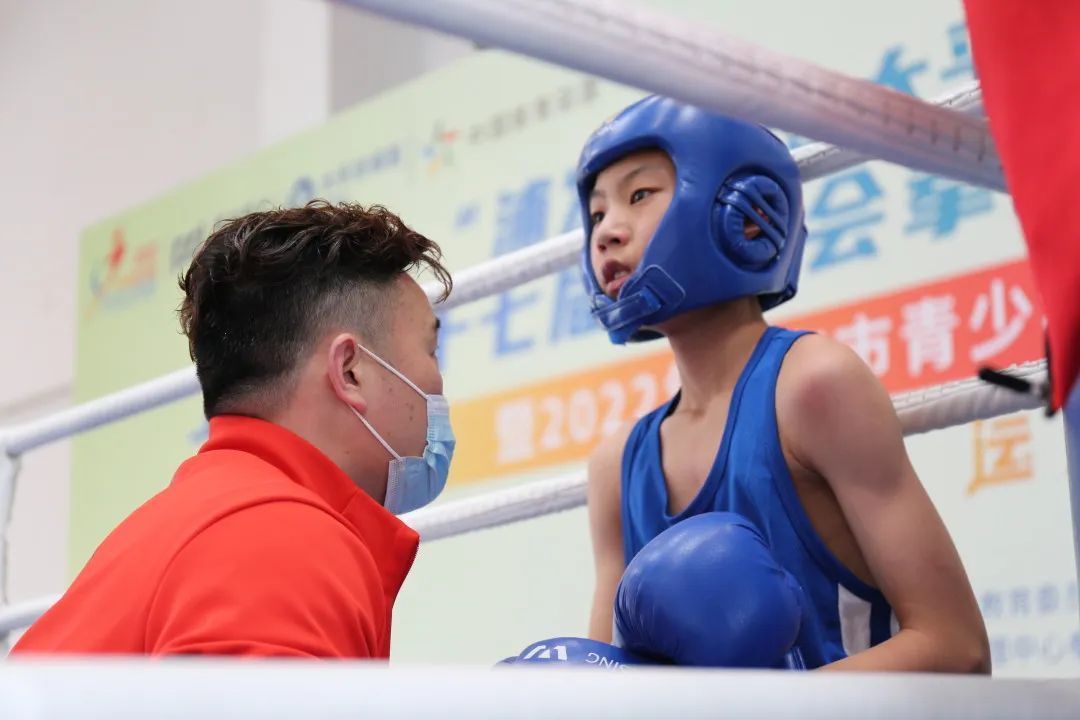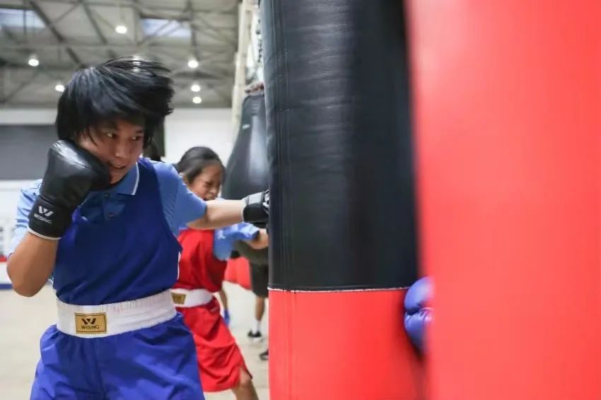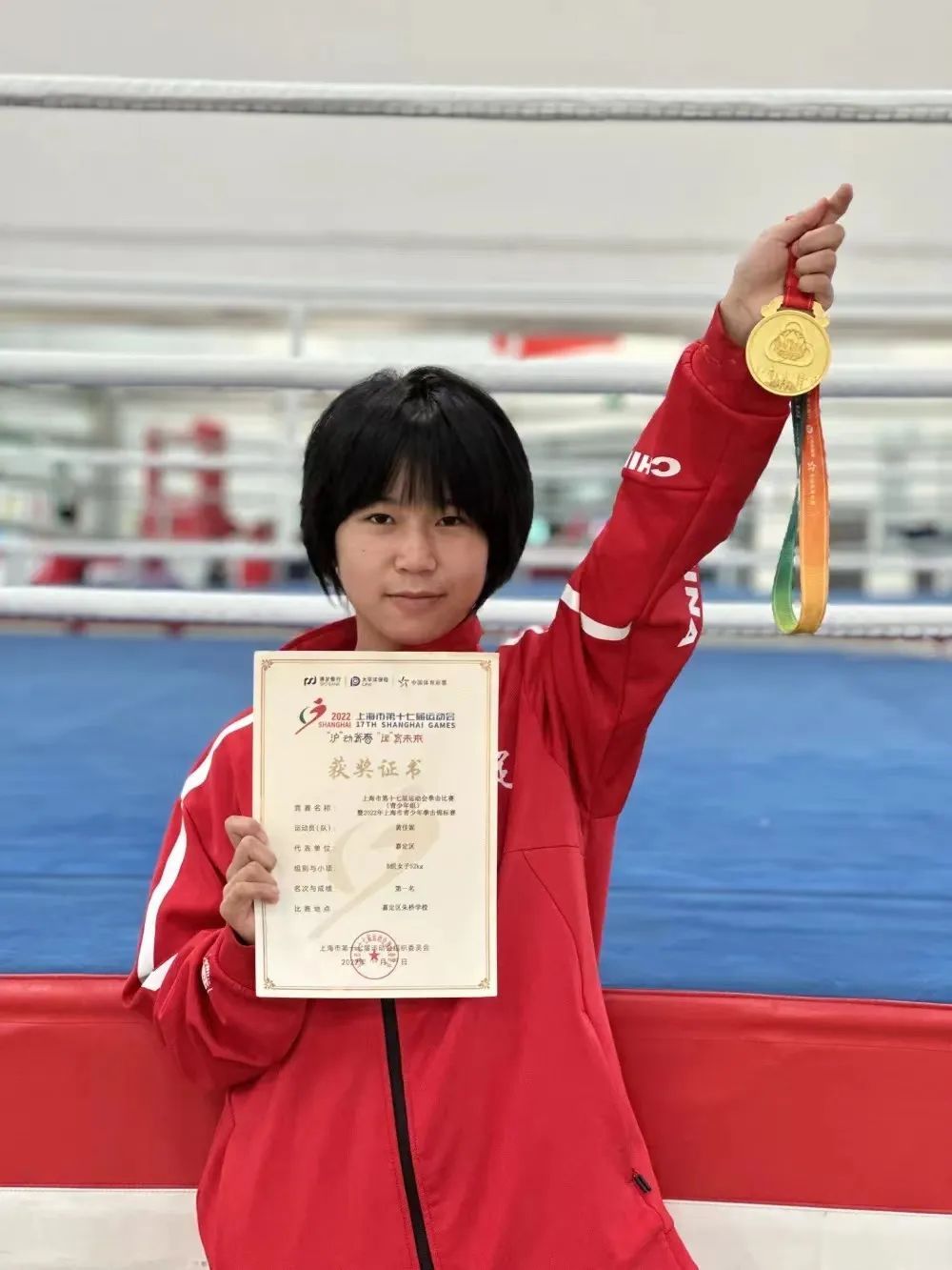 14岁的黄佳妮是一名“麻辣女拳手”,在本届市运会上获得了女子B组52公斤级金牌。六年级转学来到朱桥学校时她第一次接触拳击运动,从好奇到热爱用了两年。黄佳妮回忆:“记得自己练习几个月后第一次比赛,上场没多久就下来了,内心很失落,当时教练和队员给了我很多鼓励,从那时起,我的拳击职业生涯正式开始了。”