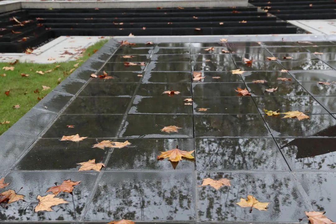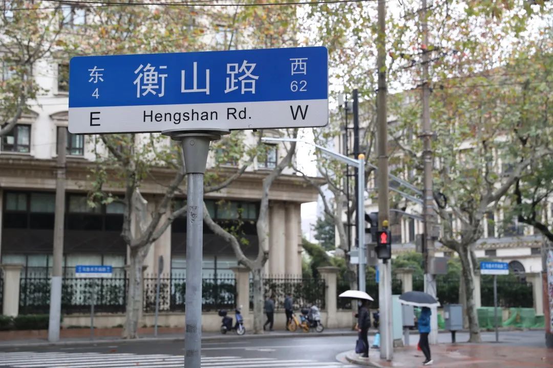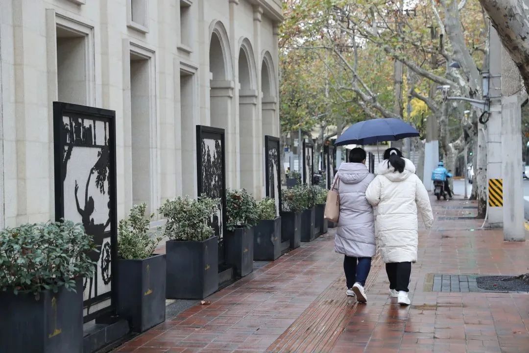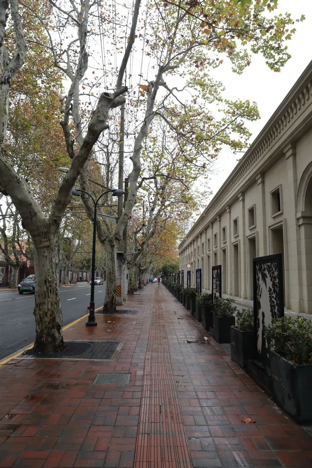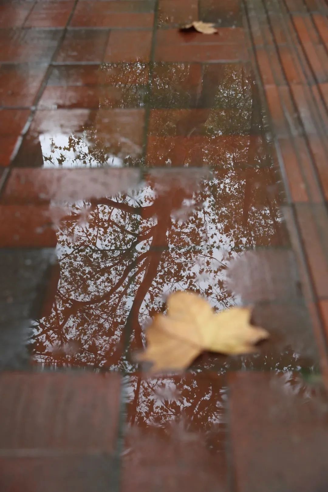 冬日里,衡山路人行道上的雨水中倒映着标志性的梧桐树,一片片枯黄的树叶四处散落,与夏日的景色相比别有一番风味。