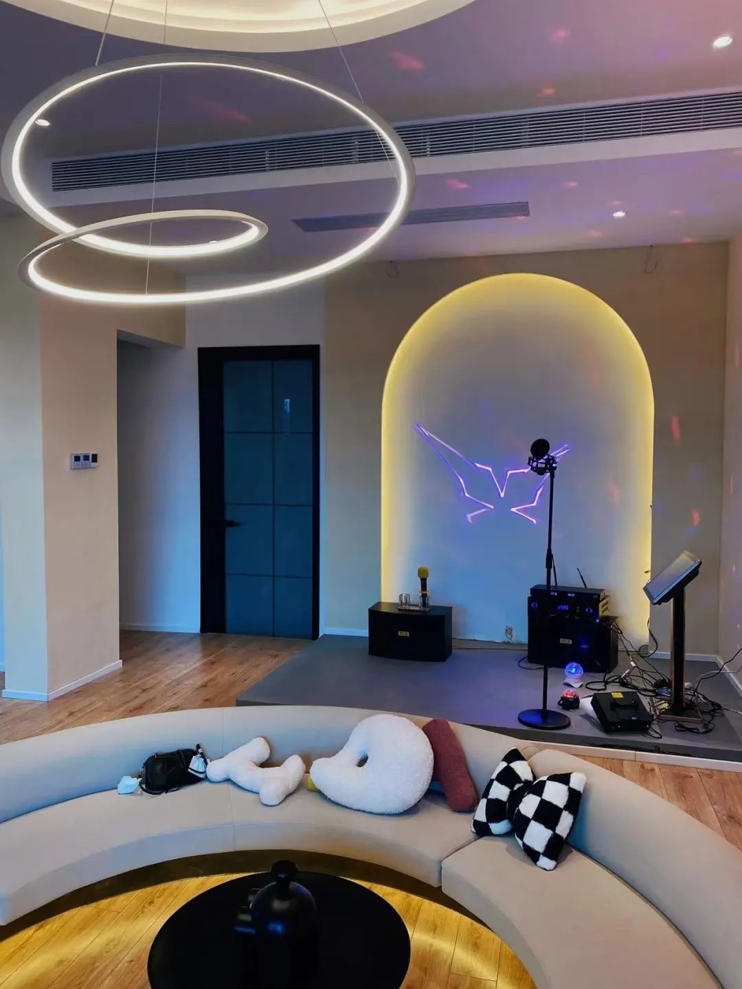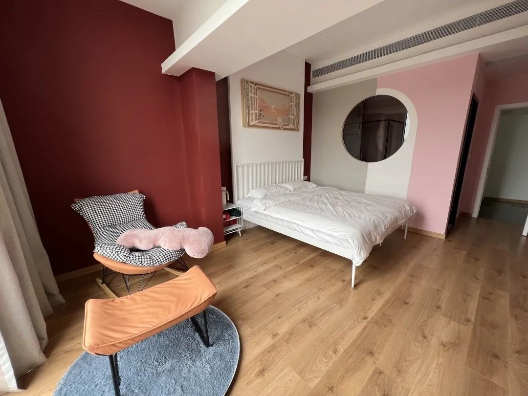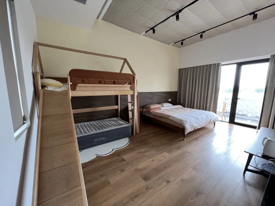 加固结构、打通隔断,墙壁改造为大面积落地玻璃,近150平方米的一层客厅宽敞明亮,下沉式环形沙发区任谁都想坐进去。楼上6间客房则可以容纳最多6个家庭同时住宿。而且每个房间都有引人入胜之处,亲子滑梯床、轻奢浴缸、通透落地观景墙、天台茶室……一次根本体验不完。