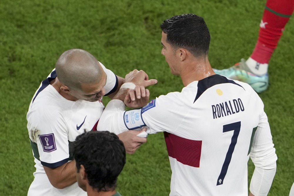 12月10日,葡萄牙队球员佩佩(左)在比赛中为队友C罗佩戴队长袖标