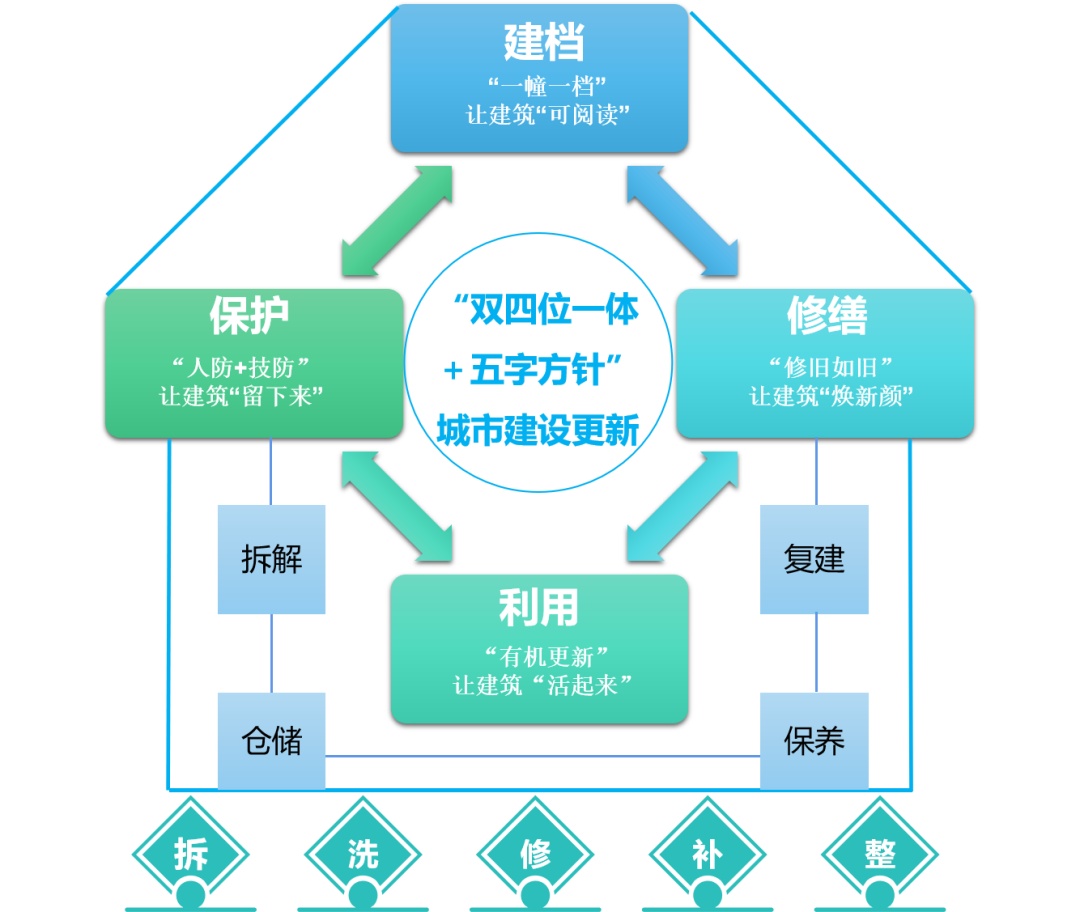 在此基础上,集团持续探索、创新质量管理模式,逐步构建起涵盖“建档-保护-修缮-利用”工作体系和“拆解-仓储-保养-复建”历史建筑修缮运行模式,及“拆、洗、修、补、整”五字工作方针的“双四位一体+五字方针”的城市建设更新质量管理模式。