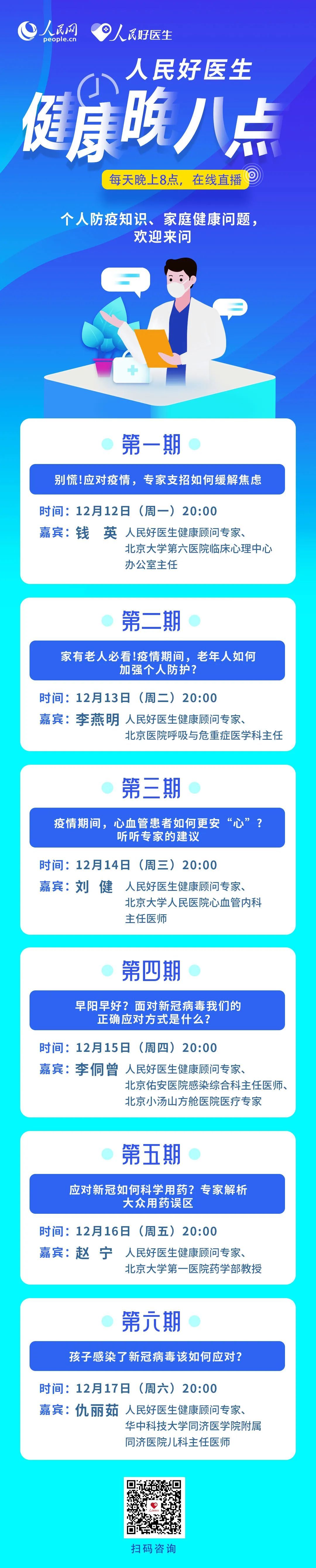 为进一步解答大众对于疫情防控科普知识和家庭成员健康的相关疑问,人民网·人民好医生客户端将于12月12日开始,每晚八点,上线人民好医生“健康晚八点”栏目,邀请各地公立三甲医院相关专家,针对大家在面对疫情时遇到的健康问题,进行在线解答和互动交流,力争做您家庭健康的顾问。“人民网+”客户端、人民网视频号等将同步直播。