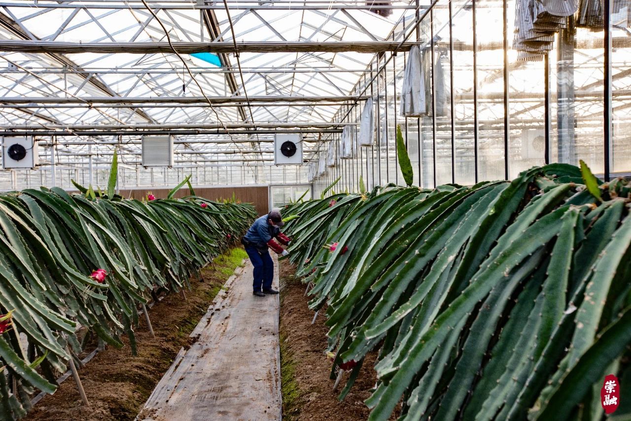 与此同时,另一边玻璃大棚内,一个个香甜多汁的红心火龙果挂满枝头,工人们忙着将刚摘下的果实称重分类。