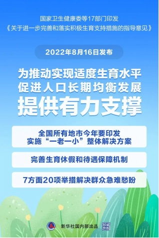 国家卫生健康委、国家发展改革委等17部门近日发布指导意见,进一步完善和落实积极生育支持措施。《意见》要求,深入实施一对夫妻可以生育三个子女政策及配套支持措施,完善和落实财政、税收、保险、教育、住房、就业等积极生育支持措施,落实政府、用人单位、个人等多方责任,为促进人口长期均衡发展提供有力支撑。提高优生优育服务水平,实施母婴安全行动提升计划。推进妇幼保健机构能力建设,各省、市、县级都应设置1所政府举办、标准化的妇幼保健机构。加强高质量产科建设,全面改善住院分娩条件。推动落实出生缺陷三级防治策略,健全“县级筛查、市级诊断、省级指导、区域辐射”的出生缺陷防治网络,强化新生儿遗传代谢病、听力障碍和先天性心脏病筛查和诊断。加强生殖健康服务,扩大分娩镇痛试点,提高不孕不育防治水平。预防非意愿妊娠,减少非医学需要的人工流产。