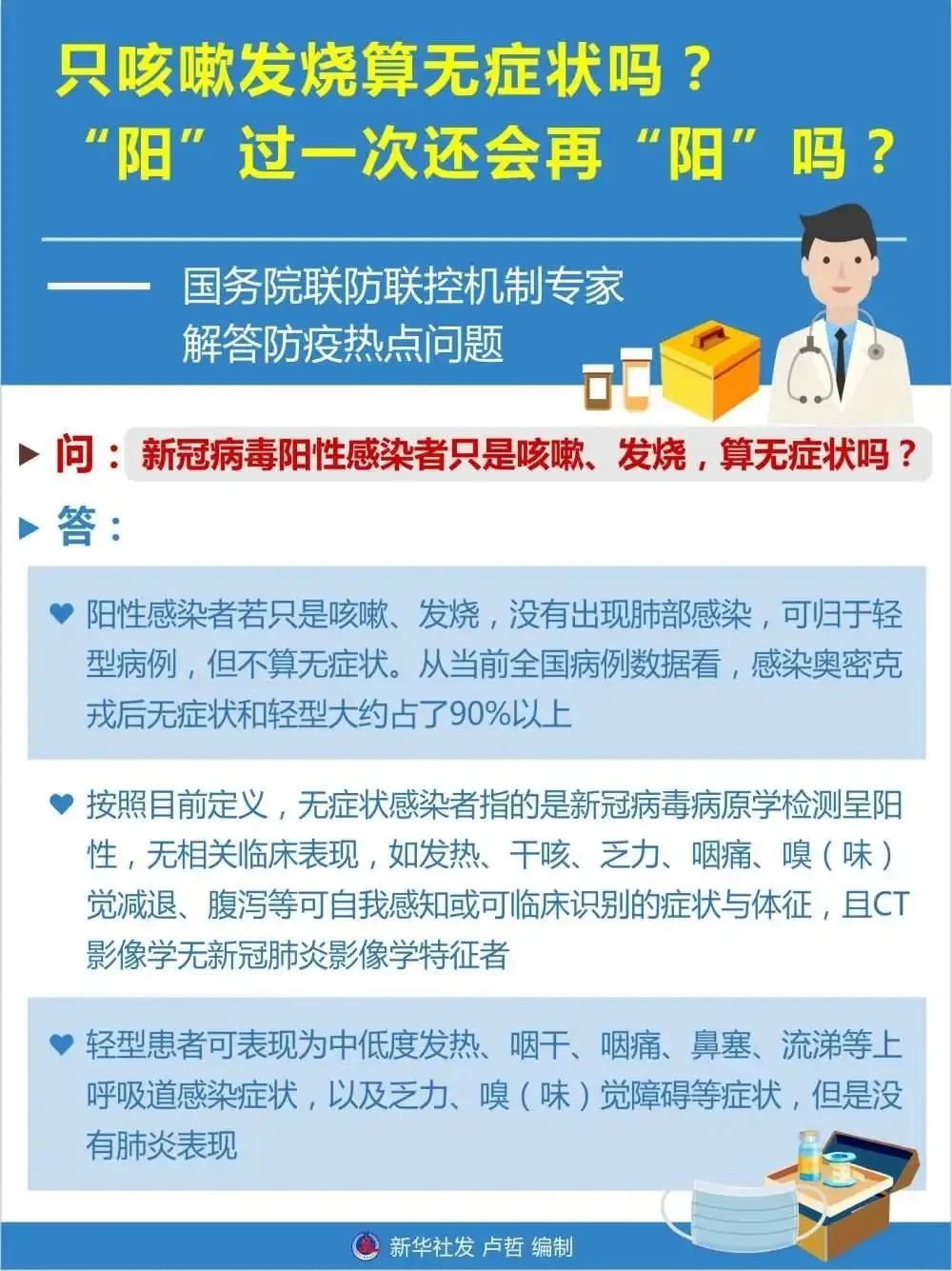 奥密克戎致病力在减弱,感染后大多表现为无症状或轻型。只咳嗽、发烧算无症状吗?“阳”过一次还会再“阳”吗?围绕公众关注的热点问题,国务院联防联控机制有关专家作出专业解答。