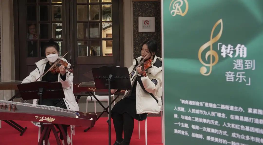 “转角遇到音乐”是黄浦区瑞金二路街道主办,紧紧围绕“人民城市人民建,人民城市为人民”理念,在南昌路打造的群众性音乐品牌,与瑞金二路浓厚的历史、人文和红色基因相结合,以每月一个主题,每周一次展演的方式与市民相约。