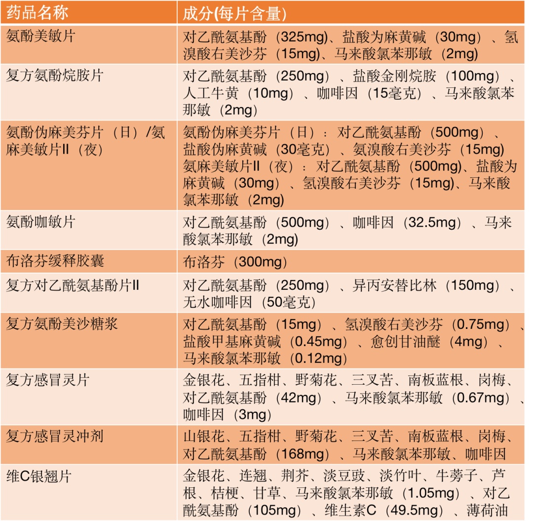 通过上面的表格我们可以看出,上述多种感冒药中都含有相同的成分,如:对乙酰氨基酚、咖啡因、马来酸氯苯那敏等。故而上述这些药物我们没有必要都囤积,选一种缓解症状即可。