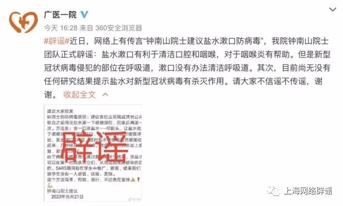 更重要的是,早在2020年1月22日,钟南山团队就公开辟谣“盐水漱口可以预防新冠”。当时,广一医院钟南山团队明确表示,盐水漱口有利于清洁口腔和咽喉,对于咽喉炎有帮助。但是新型冠状病毒侵犯的部分是在呼吸道,漱口并没有办法清洁呼吸道。而且也没有任何研究结果显示,盐水对新冠病毒具有杀灭作用。
