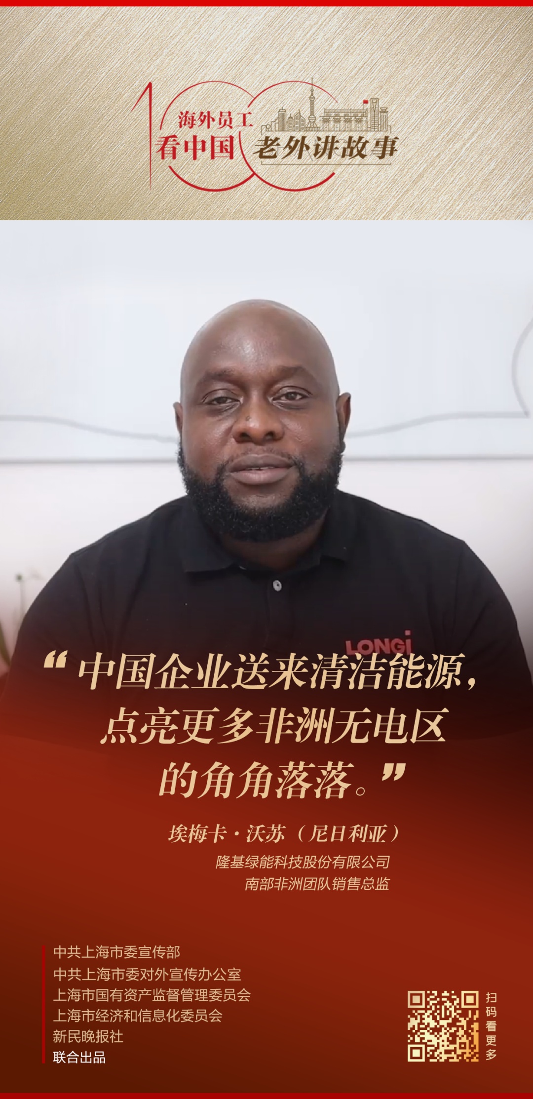 作为隆基绿能科技股份有限公司的南部非洲团队销售总监,埃梅卡·沃苏很自豪,因为自己所从事的工作,不仅能够为自己的家庭带来更好的生活,而且为非洲大陆送去了清洁能源,“点亮”了非洲,促进了非洲大陆的经济发展,改善了当地民众的生活。