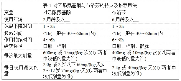 儿童常见退热药为对乙酰氨基酚及布洛芬(见表1),不推荐对对乙酰氨基酚与布洛芬联合或交替使用。