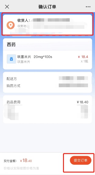 患者进入“确认订单”页,需要填写“收货人信息”,填写完毕后点击“提交订单”进行支付。