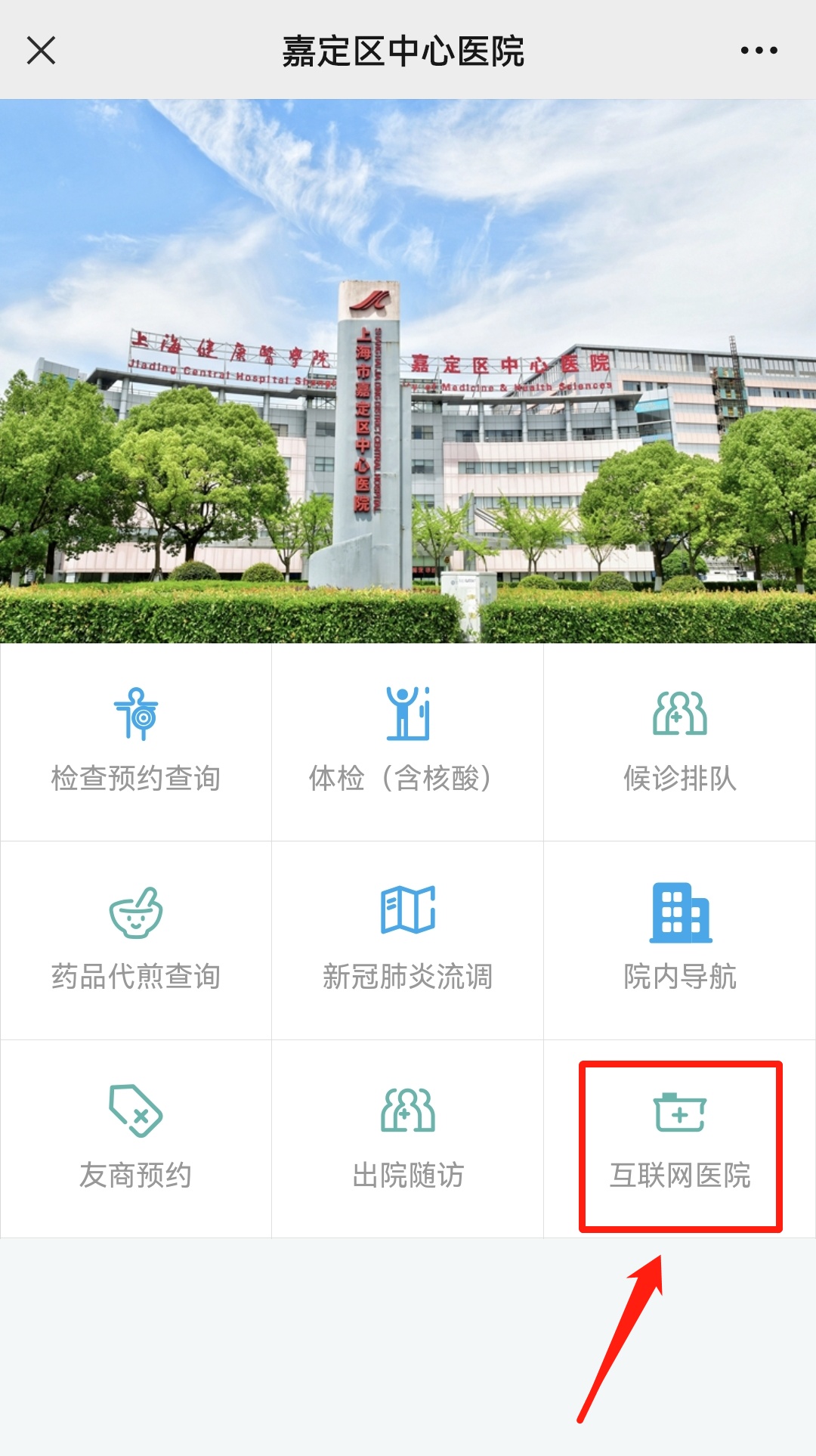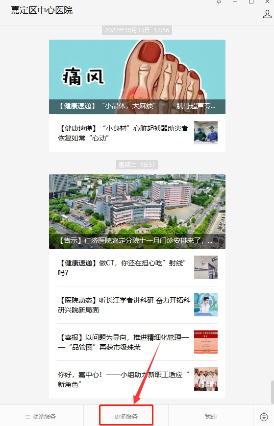 1.微信公众号搜索并关注“嘉定区中心医院”公众号,点击“更多服务”。