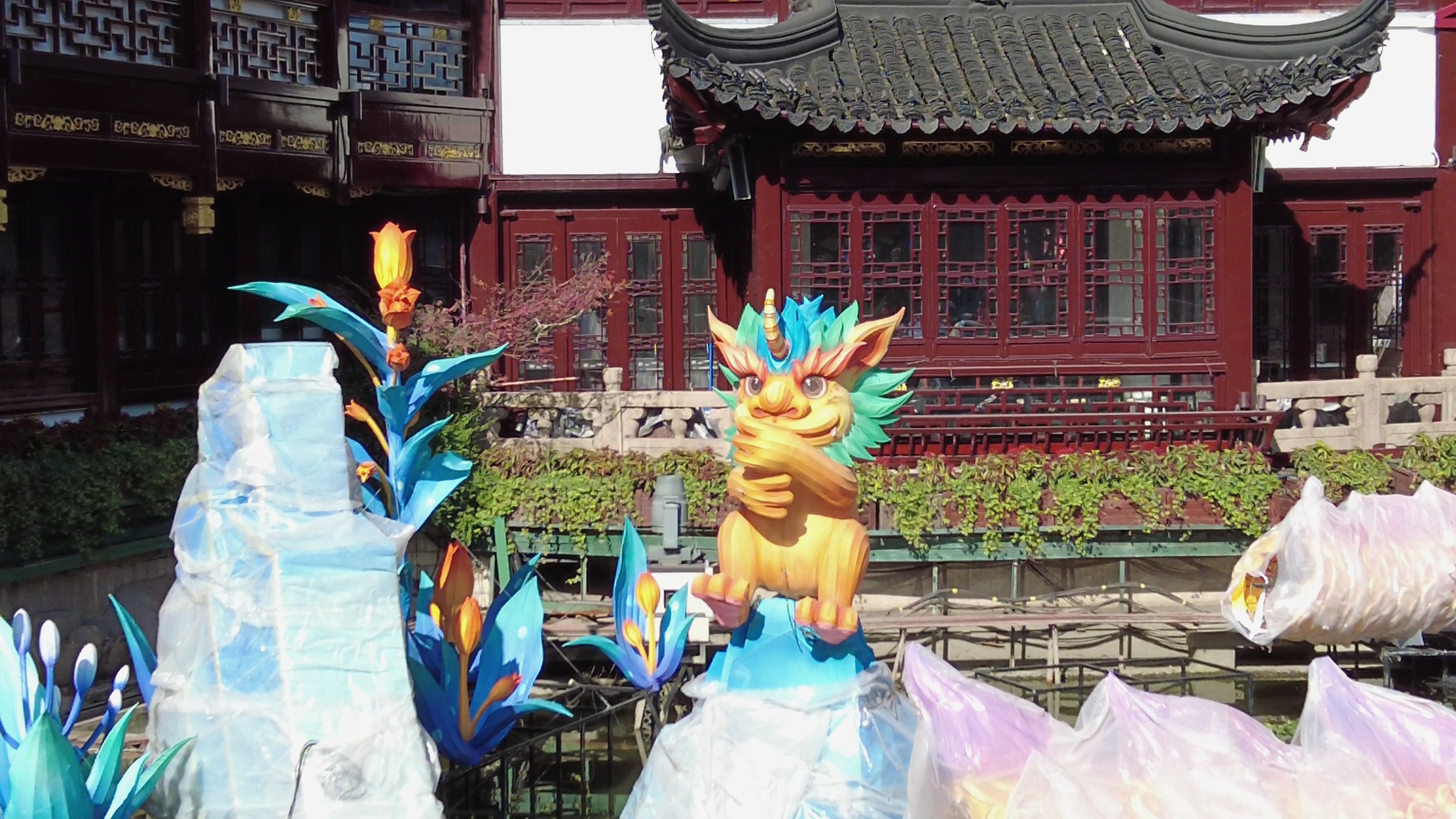 2023年“豫园迎新年”坚持传统文化的创新表达——取《山海经》中“禹定九州”的吉祥寓意,结合多元科技手段和丰富体验活动,倾力打造一个充满神仙瑞兽、奇花异草的东方美学奇境。在豫园九曲桥畔,周边的灯组已经初具模型,虽然还没有搭建完成,但是可以看出,里头的元素十分丰富,有一条非常非常巨大的盘旋交错的龙,还有卡通小龙,有九色鹿,有麒麟,有各种造型的奇花异草,还不能完全看个究竟,但是实打实地能够感受到其中的精彩。