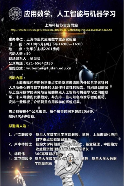 实验室还积极开展现代应用数学新知识的推广普及工作。每年的上海科技周,实验室都会面向公众举行相关科普活动。