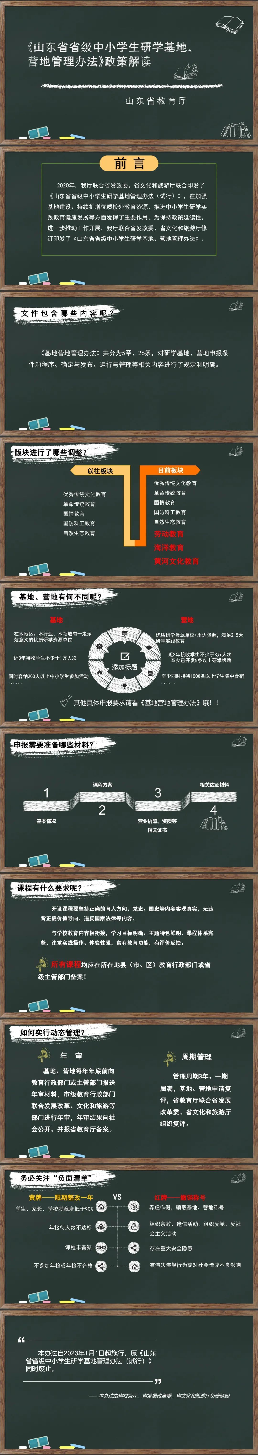 为推进中小学生校外实践教育,规范省级基地运行管理,2020年山东省教育厅联合省发改委、省文化和旅游厅印发了《山东省省级中小学生研学基地管理办法(试行)》,试行两年来,在引领提高基地建设管理规范化和科学化水平发挥了重要作用。到今年11月底,该《办法》有效期满,且中小学研学实践工作形势也发生了一些新变化。为适应研学工作发展需要,保持政策延续性,进一步推动工作开展,省教育厅联合省发改委、省文化和旅游厅对《办法》进行了修订,重新制定了《基地营地管理办法》。