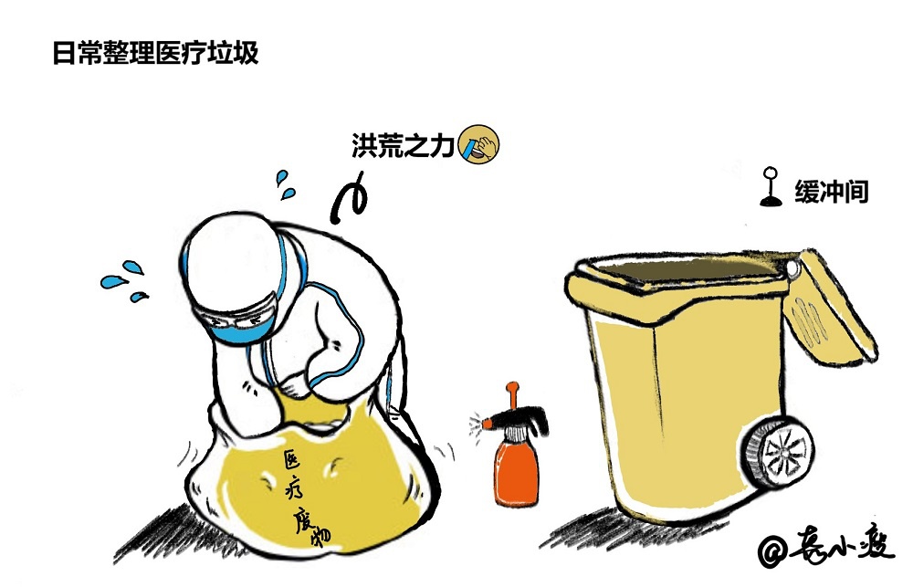 完成污染区的所有大小任务后,我们需要包扎缓冲间的所有医疗废物。每个垃圾袋几乎都有我们一个人那么高,在经过几个小时的高强度工作后,防护服内的衣服几近湿透,两层手套里的手也开始发皱,体力几乎耗尽,面对如此庞然大物,我们总是戏称“我要使出我的洪荒之力啦!”
