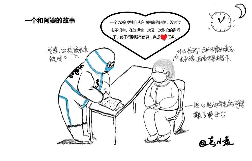 一天深夜,我们接待了一位70多岁独自从台湾回来探亲的阿婆,她没读过书也不识字,甚至连核酸筛查是什么也不知道。看着有些紧张、手足无措的阿婆,我们搬来了椅子,让阿婆休息,再一字一句讲解入住需要填写的资料和注意事项。“老吾老以及人之老”,他们需要我们的关怀。