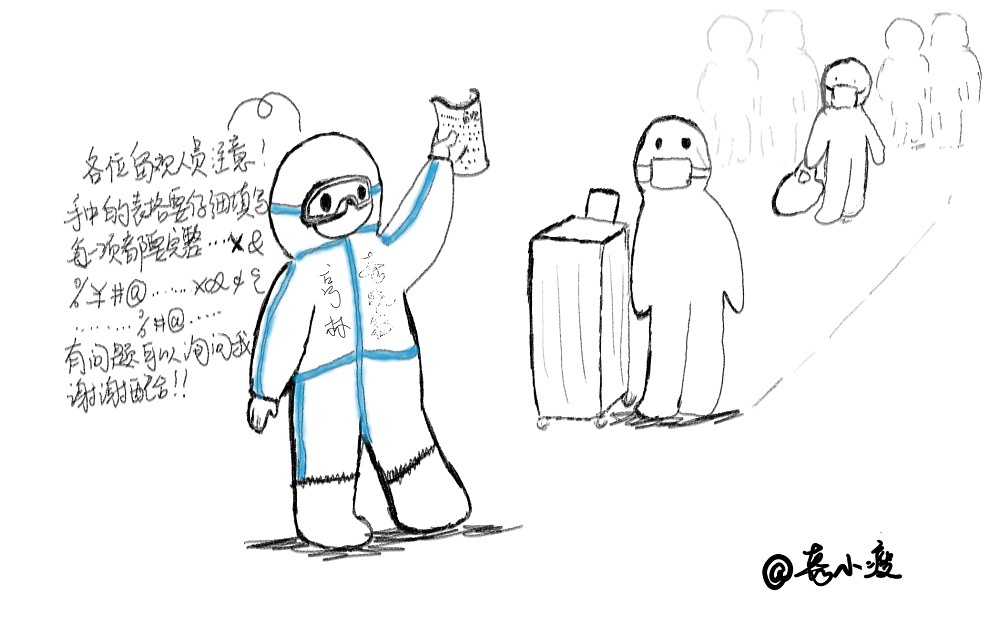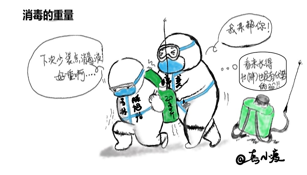 为隔离人员测量完体温、询问身体状况后,我们需要隔离酒店进行消毒。消毒桶装满消毒液后足足有二十多斤,我们需要背着它走过几层长长的走廊、大厅、电梯,还要背着它爬四个楼层的垃圾运输通道,确保每个角落都被消毒液覆盖,每次都气喘吁吁。遇到瘦小的同伴,可能无法将如此重的消毒桶背上身,此时此刻,我想,长得胖是优点,不是吗?
