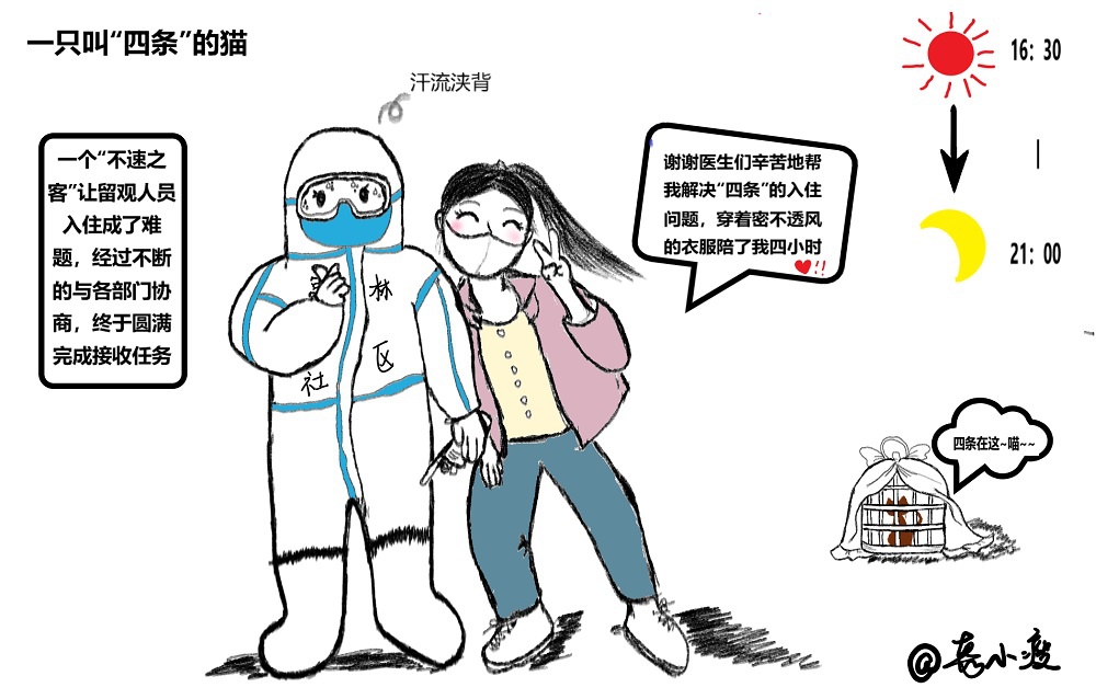 有人的地方就会有故事,故事的起因是一个叫做“四条”的猫。一次接收境外隔离人员,我们遇到了一个带着宠物的女生,因为这是金山区隔离点首次遇到接待携带宠物隔离的情况,所以需要酒店、疾控、民政等多部门沟通,研究如何接待这位“不速之客”。整个沟通过程中,我们一直陪同,耐心地与女生沟通情况,缓解她的焦虑,也聊起了“四条”这个名字的由来。最后,“四条”成功入住,女生向我们表示感谢,甚至在即将接除隔离那天,在我们上门测最后一次体温时,抱着“四条”向我们告别。