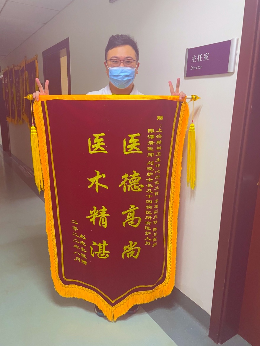 陈深册,来自台湾,上海交通大学医学院精神科专硕,目前是上海市精神卫生中心的规培住院医生。短短两个月的规培时间,陈深册收获了患者送来的六面锦旗。