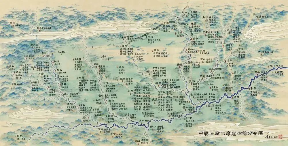 尤其值得一提的是,袁蓉荪在对巴蜀佛窟梳理、拍摄、记录工作的基础上,将近百个佛窟信息汇总,制作完成的一张手绘巴蜀石窟与摩崖造像分布图。