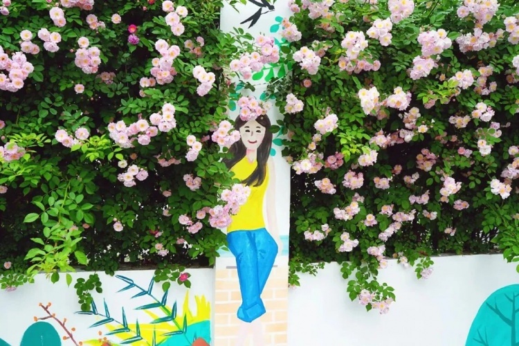 潼港八村外围,栏杆上的蔷薇花与围墙上的墙绘相得益彰,构成了附近居民喜闻乐见的特色花墙——春夏蔷薇盛开、绿意盎然,秋冬枝叶常青、围墙缤纷。围墙美化项目在保障基本功能的前提下,将围墙更好地融入到生活场景中。