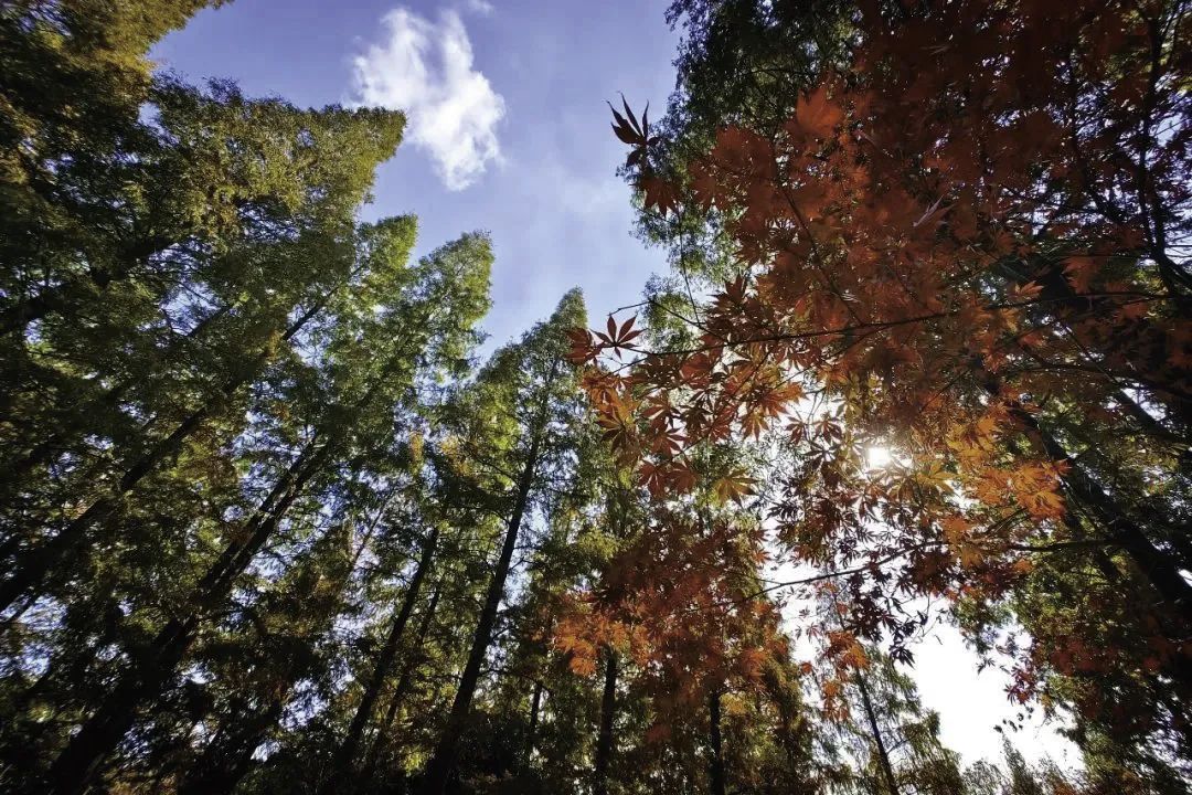 罗泾镇塘湾村公益林位于塘湾村内,初冬一至,其中的七叶树、栾树、枫香等纷纷换上新衣,用金黄与火红中绘出一幅美丽画卷。