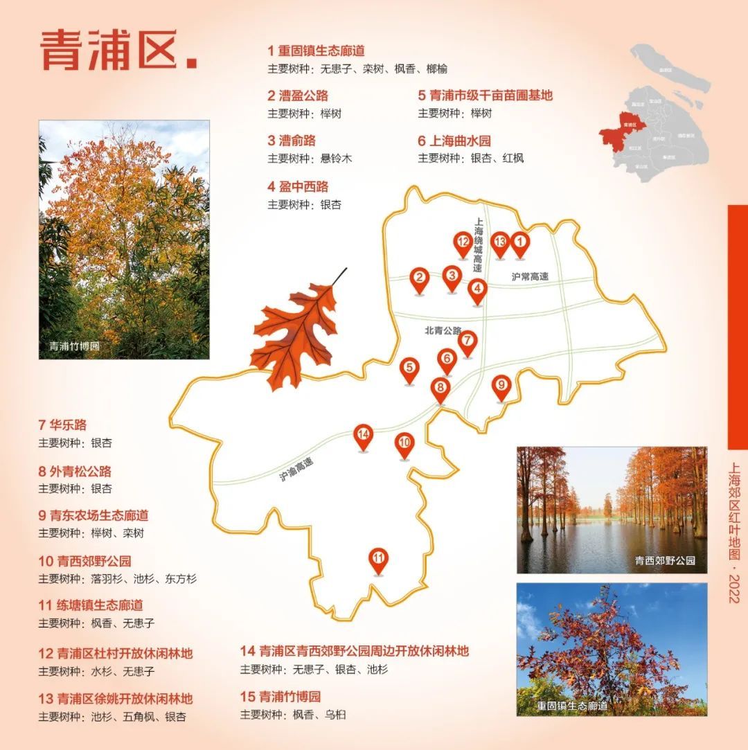 不知不觉,初冬已至。金黄的银杏大道、古朴的悬铃木老街、火红的枫香林、雄壮的水杉林……申城再一次展现斑斓美景。为满足市民森林游憩需求,提供更多更好的生态活动空间,今年,市绿化市容局、市林业总站再度为大家奉上郊区红叶地图。地图中标注了上海9个郊区的色叶观赏点,包括林地、苗圃、公园、道路等多个类型。详见↓