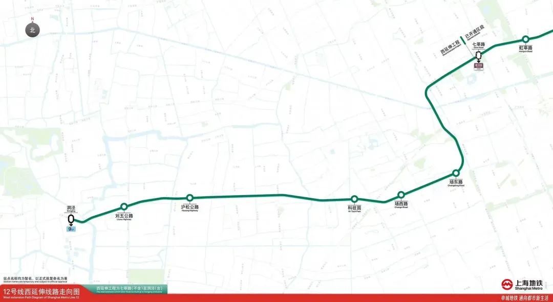 12号线西延伸工程途经松江区和闵行区,线路自既有12号线七莘路站(不含),经顾戴路、北竹港、莘松路、莘砖公路、沈砖公路,设场东路站、场西路站、科技园站、沪松公路站、刘五公路站、洞泾站,共6座车站。其中洞泾站与9号线换乘,线路全长17.27公里,采用全地下线敷设方式。